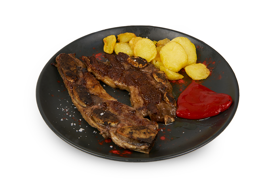 Entrecot de lomo bajo de ternera, aceite de oliva, sal y pimienta al gusto, patata, pimiento verde