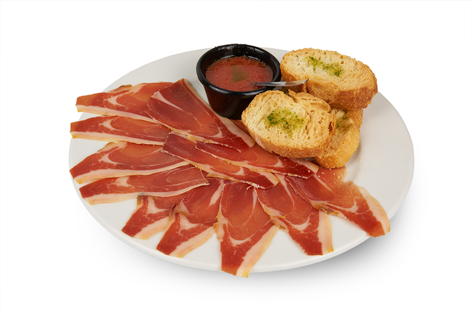Jamón de Teruel con pan tostado, aceite de oliva virgen y tomate rallado